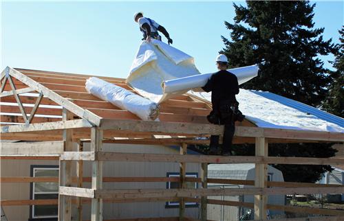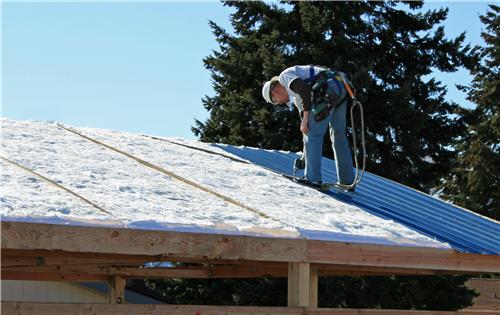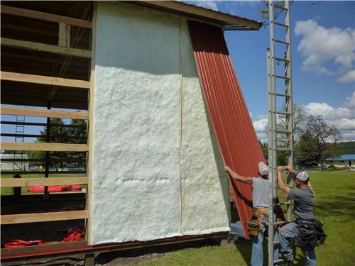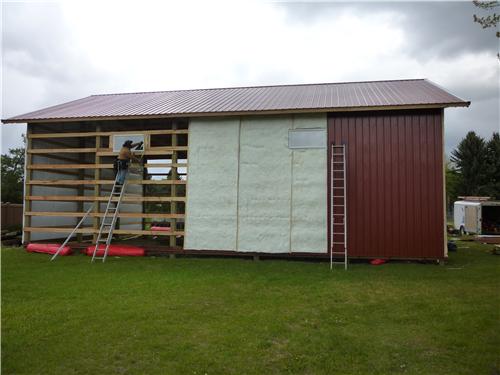 2.5” insulation is the most common used product for the typical Post Framed building. Laid with a white reinforced vinyl backing, the insulation blanket is attractive and economical. Rated at an R-7 it helps reduce heat transfer and condensation. All of our buildings come standard with the 2.5” insulation in the roof and can be added to the side wall as an additional option. (Please note: If the roof is wood decked this product can’t be used).