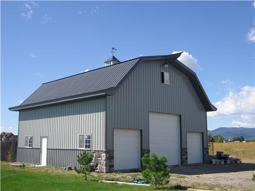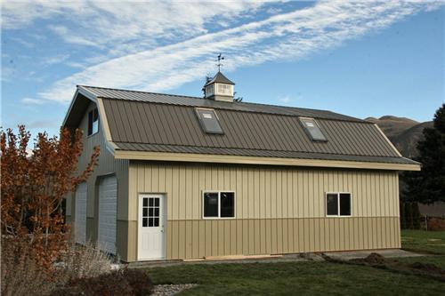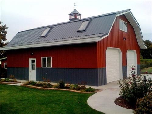 A Gambrel or “barn” style roof is simply a gable roof with a change in slope partway up the roof. This unique look gives the Gambrel building a country or farm appearance. The truss design can create a broad upper story to maximize the usable floor space in the attic. A loft floor can be incorporated for the use of a storage or bonus room.