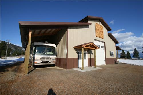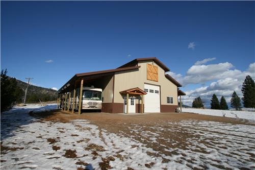 This remarkable project consists of a 44′ x 70′ x 14′ clear-span “Monitor” style pole structure with a 12′ x 70′ x 12′ lean-to on one side for RV parking. The center section of the “Monitor” style is 20′ wide with an integrated 3′ jump in the roof lines. This offset in the roof lines allows for creative lighting provided by the (4) 4′ x 16″ windows above the low roof. Supplemental 4′ x 16″ windows were placed below the low roof eave as well. (1) 12′ x 14′ O/H door was centered in each gable end as well as (1) 3′ x 6’8″ man door and (1) 6′ x 6’8″ double man door at opposing ends. Decorative Cross-Bucks doors were added both on the eave wall and the gable-end walls above the O/H doors. And entry canopy was constructed to shield the Double Man door from weather as well as the 4′ x 70′ canopy above the decorative Cross-Buck doors. All roof elevations utilize 24″ overhangs. The body color of the project is Sandstone, with Brown Roof and Wainscoting.