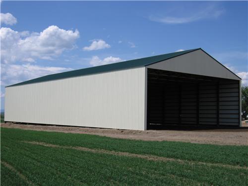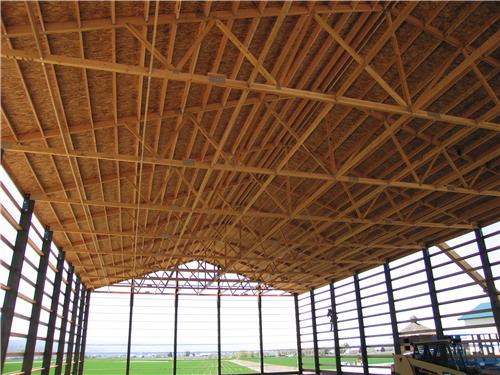 This building was designed for hay storage. The front gable end is open. The eave height is 21′ tall and the roof is decked with 7/16″ OSB for additional strength.