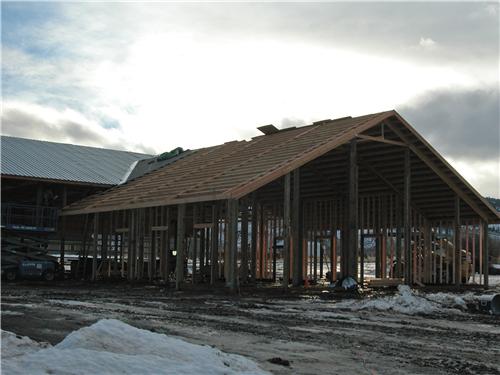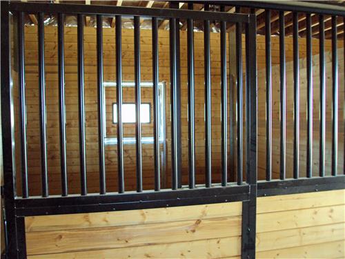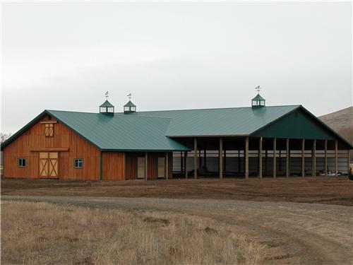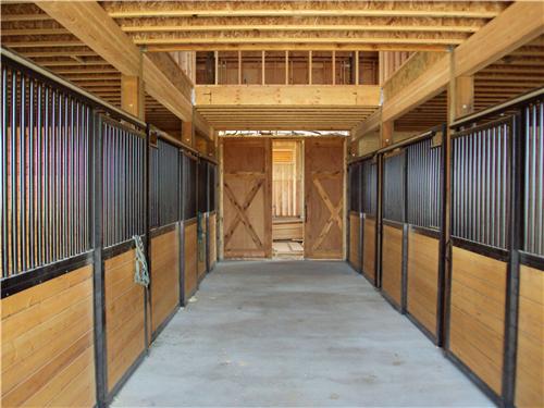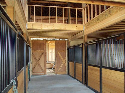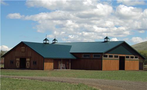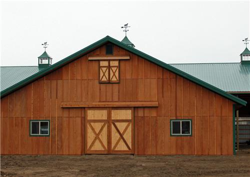 A horse lover’s dream building. The riding arena is 70’x108’x16′ and the barn is 52’x48’x14′. The siding is stained cedar board and battens. All sliding doors are custom built with a crossbuck design. There are (6) 12×12 stalls powder coated black and lined with 2×6 T&G. The roof features 2′ overhangs and (3) 48″ cupolas.